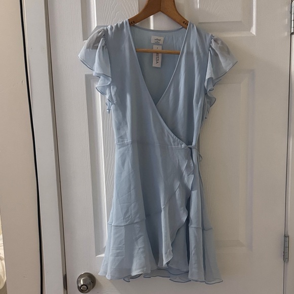 Chic sky blue mini dress with ruffle sleeves. Wrap design for a flattering fit.