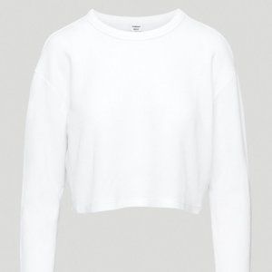 This is a boxy thermal longsleeve with a crew neckline. It’s made with cozy, baby waffle-knit fabric. White, cropped, boxy fit, ribbed trim, dropped shoulders. Good Condition.