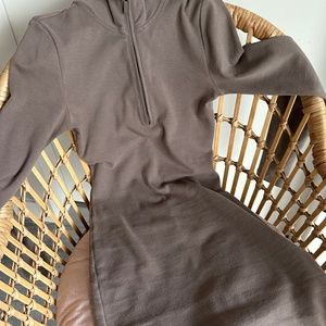 This is a half-zip, long-sleeve dress with a mock neckline. It’s made with soft, stretchy baby-rib fabric.