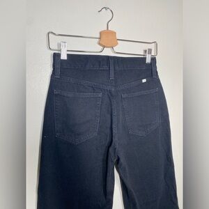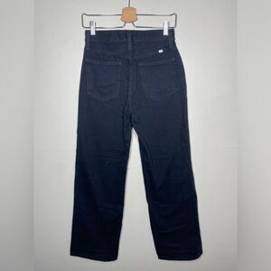 No obvious signs of wear, in excellent condition. These are baggy high-rise jeans with a wide leg. They’re cut from non-stretch denim made with recycled cotton. This version comes in a washed black with a clean hem.