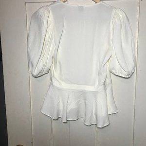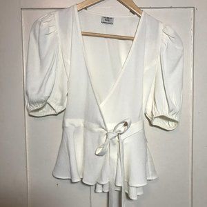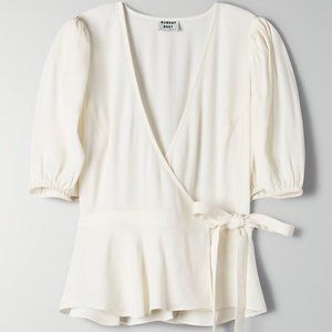 Puff-sleeved, tied blouse from Aritzia in colour 'coconut'.