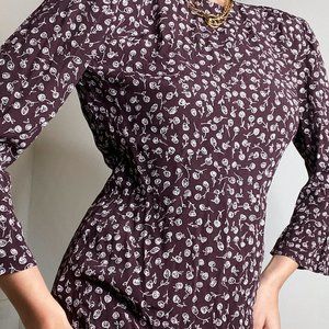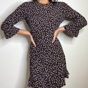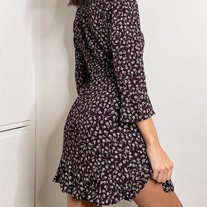 This is a tulip-sleeve mini dress with a ruffle hem. It's made from drapey fabric with a subtle pebbled texture. This version comes in an exclusive print designed in-house.