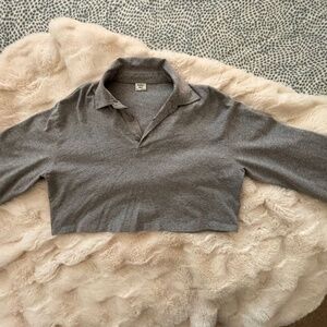 Button Down top with collar, falls just at the waist, heather chrome grey