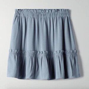 This is an A-line mini skirt with a smocked waist and a flounced hem. It's made with drapey, crepe-like fabric
