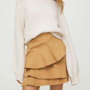 It could be you, or someone you know. This is a ruffled, A-line mini skirt with a tailored waist. It's made with a stretchy cotton blend fabric.
