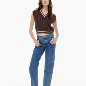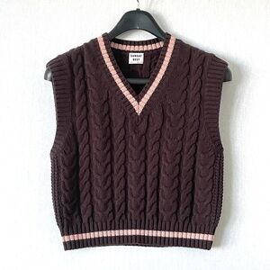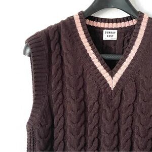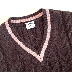Aritzia Sunday Best Winston Sweater Vest Size XXS Colour Brown, pink This is a relaxed, cable-knit sweater vest with a V-neck. It’s knit with an extra-fine merino wool-cotton blend that’s lightweight and super soft against your skin. Approximate measurements Pit to pit 16.5” Length from shoulder to hem 18”
