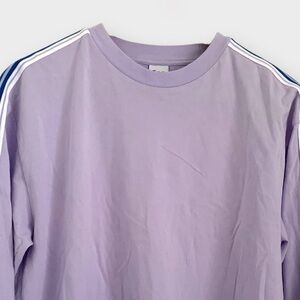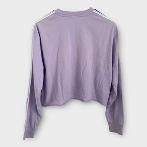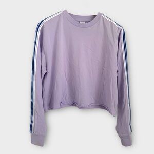 TNA purple, solid, crew neck, cropped, long sleeve tee. Side stripe tape detailing along arms. Unfinished raw hem with a relaxed fit. Soft cotton construction with a banded neckline and cuffs.