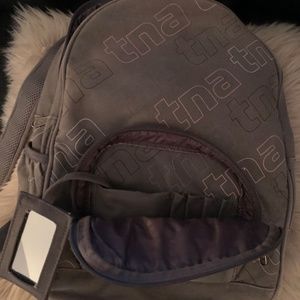 *sold* TNA Signature Print Backpack 🎒 Vintage Gray with pink, white, teal lettering. Some wear, with brown small spot on bottom of bag. Otherwise in good useable condition.