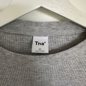 Cozy gray sweater by TNA. Features a classic crew neck and long sleeves. Perfect for layering.