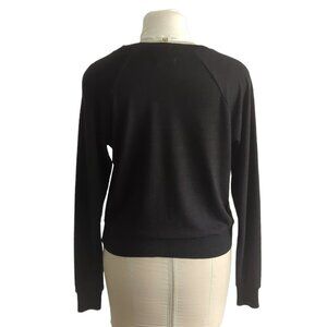 This is black crew neck raglan sleeve top by Aritzia's TNA brand. It's made from reposa fabric, Aritzia's signature stretch jersey fabric.