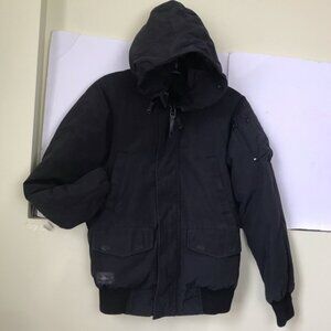 Bomber style parka with a classic fit, cinchable snorkle hood.