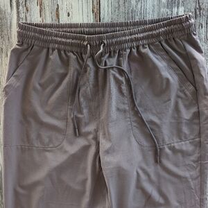 These are mid-rise joggers with an elastic waist and cuffs. They're made with ultra lightweight, drapey, sweat-wicking fabric that's soft and smooth.