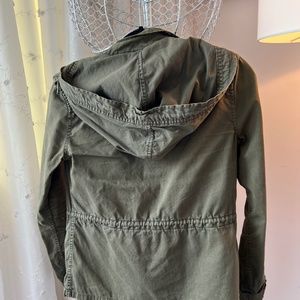 Ready for warmer weather? Here is the perfect jacket by Aritzia Talula. Army green colour with patch front pockets with domes. Drawstring on attached hood with drawstring at waist. Very nice removable liner for those warmer days.