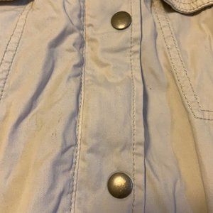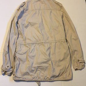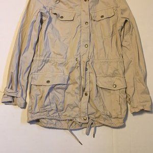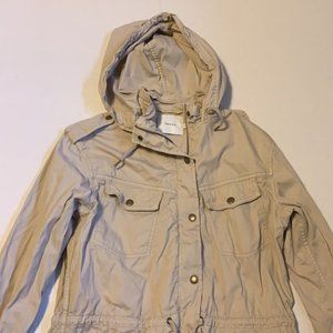 GUC Talula tan trench coat / long cargo jacket from Aritzia with hood and drawstring waist in women’s size small.