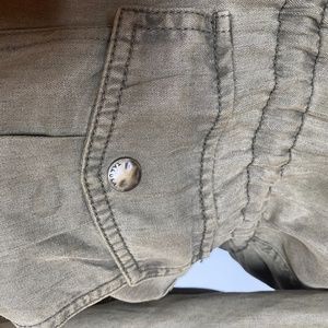 This classic jacket is an essential in any closet. The lightweight feel of this piece is good for summer nights or layering in the fall. The body is 80% Lyocell and 20% Hemp. Easy to clean, wash in cold water and hang to dry. The army green colour makes this a great basic, and the hardware is toned down so it won't clash with gold or silver jewelry.