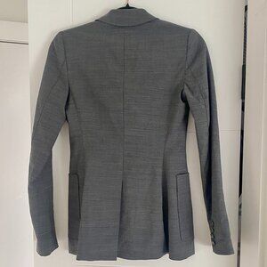 Lightweight and feminine Aritzia Talula Sunday Best blazer in size 0. This blazer features a slim fit or a more relaxed silhouette, is fully lined with small shoulder pads, has three pockets, a beautiful collar, two buttons, and a back vent. It is grey with a fine woven pattern or herringbone. The Blazer is made from 59% wool, 39% polyester, and 2% spandex, with a 100% Cupro Rayon lining.