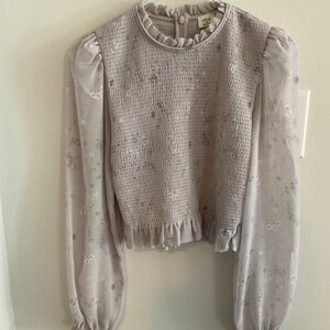 A smocked blouse with ruffled edges and voluminous puff sleeves. It’s made with lightweight, semi-sheer chiffon.