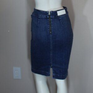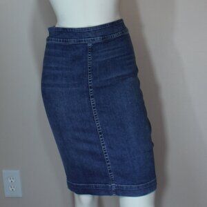 Denim skirt in like new condition! This stylish midi skirt; 98%; cotton ;2 % spandex ,Pre-owned ; please look at the photos regarding condition.