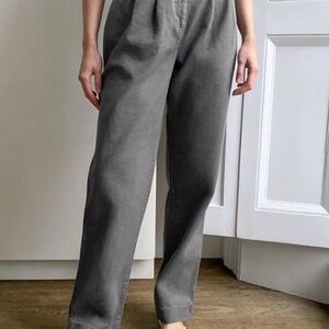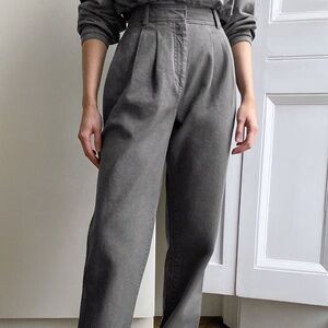 These are workwear-inspired, high-waisted pleated pants with slash front pockets and back welt pockets.
