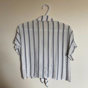 This short-sleeve blouse is made with a softly textured fabric and has a cropped silhouette with a cute front tie. Oversized - fits more like an XS.