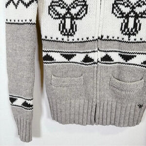 WHAT: This shawl-collared sweater is knit. Made of 100% Lambswool,features a custom-designed intarsia Spiro pattern. Fastens with an exposed metal zipper finished with a logo zipper pull. Inspired by traditional Cowichan techniques from the Pacific Northwest.2 slash pockets