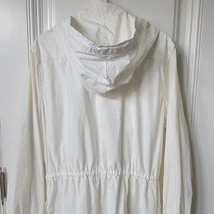 Aritzia Talula, NWT, Size L, in Oak, Ivory colour with silver toned and hammered hardware, full zip front with additional snap placket, 4 front snap pockets, adjustable snap cuffs, adjustable attached hood, adjustable waist.