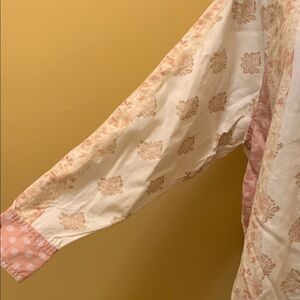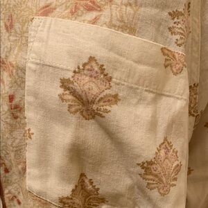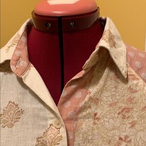 Chic button-up with floral patterns. Soft cream and pink hues.
