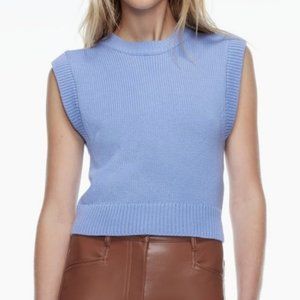 No longer in stock on the site and only worn twice! This vest is made of a super soft n comfortable (not itchy) 55% merino wool and 45% cotton blend. It is a gorgeous periwinkle color in Soft Iris as pictured. I can see this styled like Rory Gilmore with a white button up, pleated skirt, and dark loafers since its such a preppy bluish color.