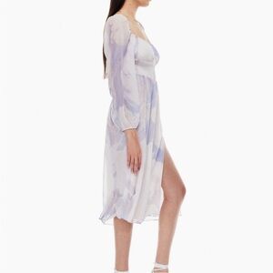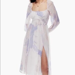 This is a square-neck midi dress with a smocked waist and puff sleeves. It's made from lightweight semi-sheer chiffon.