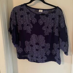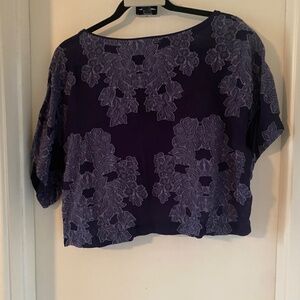 This blue boxy tshirt style blouse is slightly cropped, looks great with high waisted jeans or pants. Appliqué floral embedded into fabric. GUC
