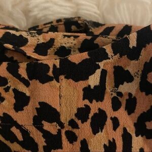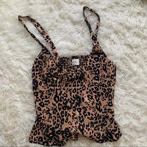 This is a tie-front peplum tank-top blouse with a sweetheart neckline, smocked elastic back, princess seams on the bodice and a keyhole opening at the front. It's made with lightweight pebbled fabric in a custom leopard print.