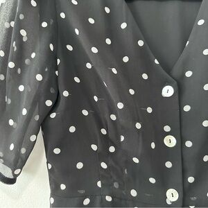 Aritzia Wilfred Button-Front Short Sleeve Dress in Black with White polka dots. This dress has short, sheer princess sleeves, a fitted bodice that defines the waist, and an A-line skirt that floats away from the body. It's made with lightweight, chiffon-style fabric. This version of the Button-Front Dress comes in a polka-dot print.
