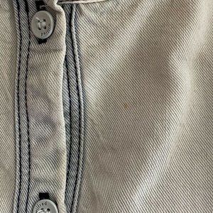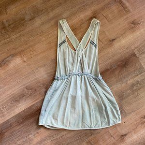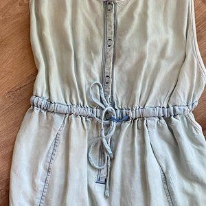The cutest dress for summer, oh my goodness. This dress is a size small and features a drawstring waist--I am a medium and this dress also fits me well. Features button details and side pockets, as well as an 'overall' style back. Note there is a small stain on the front of the garment (as pictured). 100% lyocell.