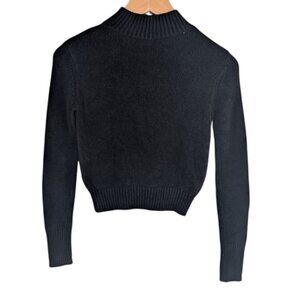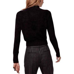 This is a lightweight black mock-neck sweater by Aritzia's Wilfred brand. It's knit with a velvet-like chenille fabric that has a slight sheen to it.
