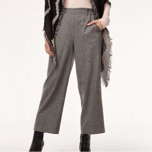 Aritzia Wilfred Easy Pant High-Rise Wool Cashmere Blend Trouser Pants. In the shade, Dark Grey Herringbone which is a light grey herringbone pattern with grey and white throughout/ These are high-rise trousers with an elasticated waist. They're made with Italian wool flannel that has a hint of stretch. Pull-on wear. Two front slash side seam pockets. Fabric from Italy. High rise, wide leg, cropped ankle length (please note that this is the style of the pant but varies according to your height and measurements as well. Perfect to wear for a timeless, chic, elevated, modern, dark academia, light academia, contemporary look or to wear to work or the office for a workwear, career wear, business casual, smart casual, or business professional. The perfect color for the fall, winter, and spring months. Pairs great with a blouse and heels or boots.