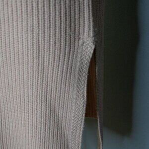 This Durandal sweater from Aritzia's Wilfred line is a sleeveless, tunic-style sweater with a funnel neck and side slits. It's made with lightweight, extra-fine merino wool fabric in a soft baby pink colour.