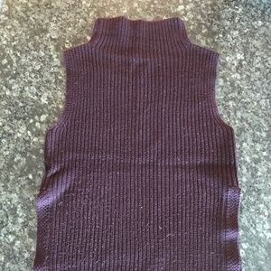 Sleeveless, tunic-style sweater with a funnel neck and side slits.