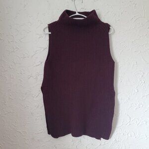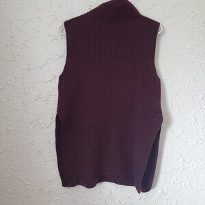 This is a sleeveless, tunic-style sweater with a funnel neck and side slits.