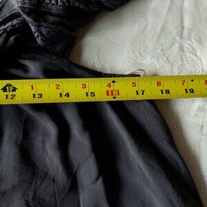It features a ruffled overlay that sits on shoulders, fully lined with crochet trim made with a unique fluid fabric that gives off a boho crinkled texture.