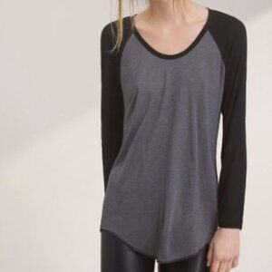 Aritzia Wilfred Free Baume baseball tee. The gray fabric is also around the neck and lined along the hem and down the sides. 100% viscose. Super soft and comfortable perfect for lounging around in