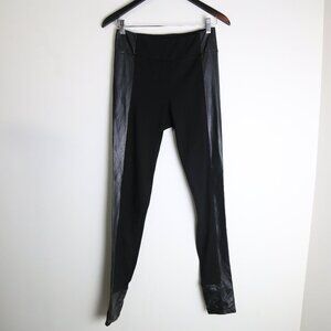 These are high-rise leggings with a tight fit and wide waistband for a smooth silhouette. Faux leather/vegan leather side panels with a soft inner legging material. Front and Back: 68% rayon, 28% nylon, 4% spandex. Side: 100% polyurethane. In gently pre-loved condition with minimal signs of wear.