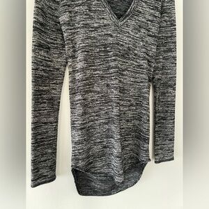 Made with a soft, highly textured jersey fabric, this V-neck tee is designed with a unique back opening and long, slim sleeves. Lovely dark black and grey heather texture, long length, slim fitted and high low hem. Very good preowned condition with minimal signs of wear. Women's size small.