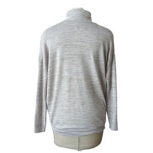 This is a long sleeve relaxed fit mock neck shirt by Aritzia's Wilfred Free brand. It's made from Wilfred Free's signature Reposa stretch jersey fabric in grey and beige space dye.