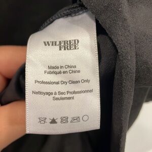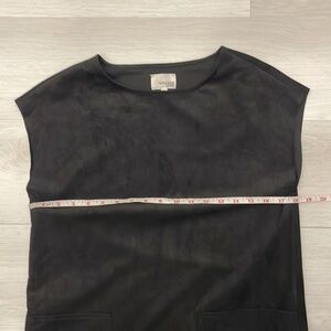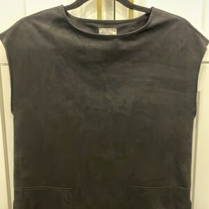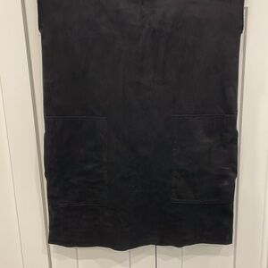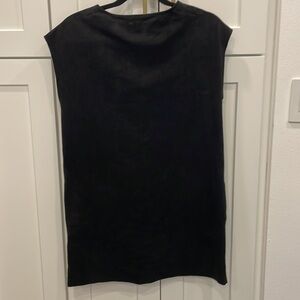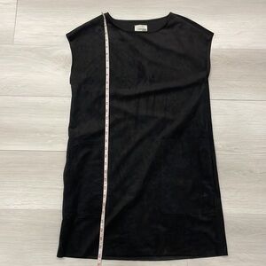 Aritzia Wilfred Free black Faux Suede sleeveless dress with two faux front pocket details on front and two hidden pockets on sides, oversized boxy fit, hem line hits above the knee. Size XXS. Good used condition. Please see photos, measurements are for reference only. Reasonable offers welcome!