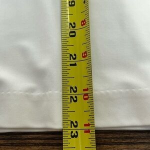 In very good condition, this sleeveless tunic in a creamy white has a wide wrap around tie that wraps all around folding over at the front and tying at the back. There is a small hole at the front under the tie area so can’t be seen. See last picture. Size is x-small with some stretch. See measurements.