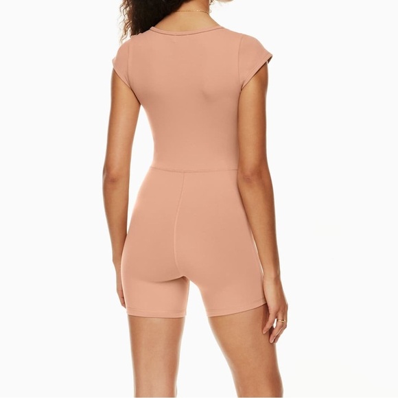 This is a romper with cap sleeves and a square neckline. It's cut from stretchy, body-hugging fabric that's sweat wicking and cottony soft.