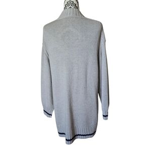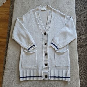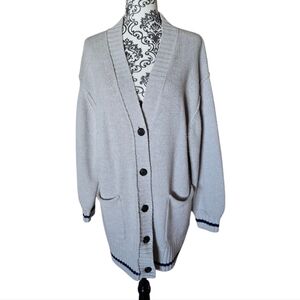 Oversized button up cardigan, 100% merino wool, grey with navy blue stripes. In good used condition, some minor pilling. Brand size 2 = small/medium as per size chart