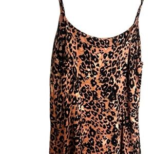 It's practically begging to be layered with a baby tee. This is a sleeveless mini dress with spaghetti straps, a square neckline and waist seam. It's made with a pebbled crepe fabric. This version of the Isabelle comes in a leopard print that was designed in-house.