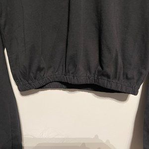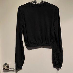 Cropped long sleeve 100% cotton tee with elastic at waist and sleeves. Looks cute with high-waisted dress pants or skirts.