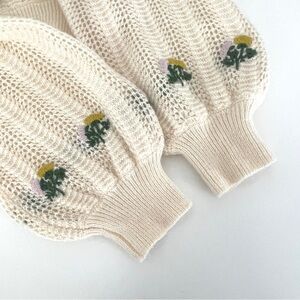 This is a crew-neck, puff-sleeve sweater with embroidered floral motits. It's knit with a fuzzy, lightweight, wool blend.